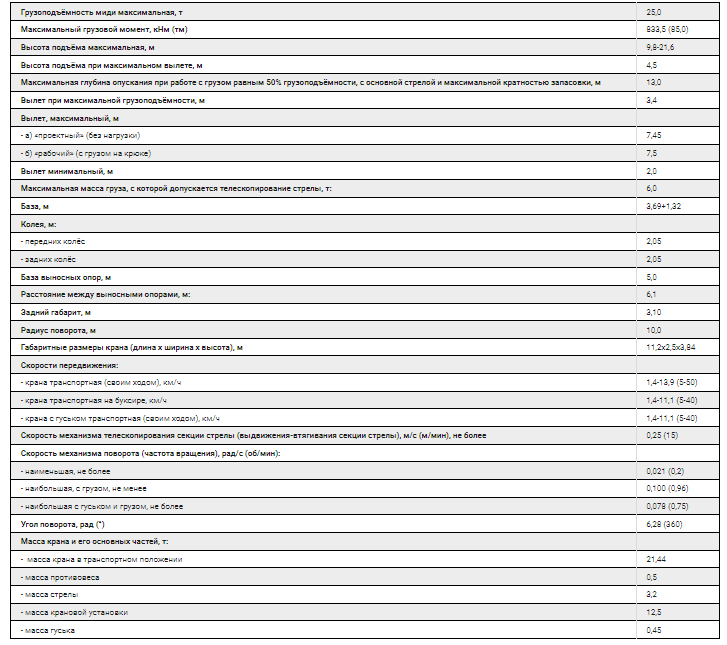 Трехсекционная телескопическая стрела длиной 9—21 метров во втянутом положении обеспечивает крану компактность и маневренность при переездах, а в выдвинутом — широкую рабочую зону и большую высоту перемещения груза при работе.