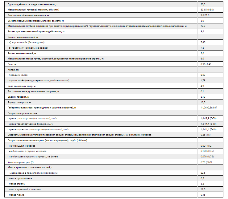 Трехсекционная телескопическая стрела длиной 9—21 метров во втянутом положении обеспечивает крану компактность и маневренность при переездах, а в выдвинутом — широкую рабочую зону и большую высоту перемещения груза при работе.